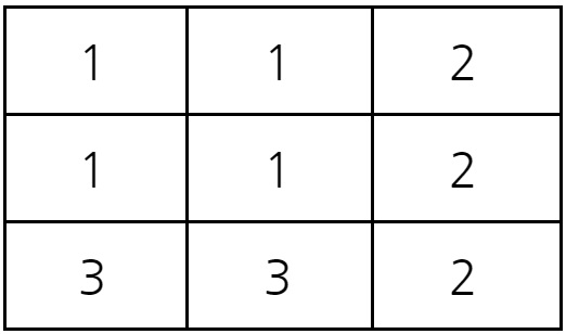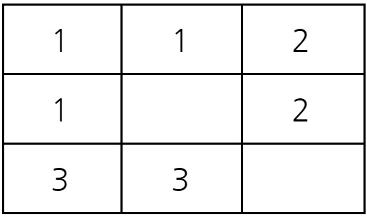 예를 들어 다음과 같이 3x3 크기의 시험관이 있다고 하자. 서로 다른 1번, 2번, 3번 바이러스가 각각 (1,1), (1,3), (3,1)에 위치해 있다. 이 때 2초가 지난 뒤에 (3,2)에 존재하는 바이러스의 종류를 계산해보자.